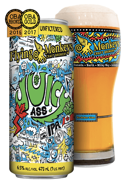 This award-winning American IPA moshes bright, fruity notes, dank hoppy bitterness, and fresh verdant resins with sticky malts for a softly carbonated, unfiltered flavour. From the busy minds and happy hands of the Flying Monkeys comes Juicy Ass IPA.