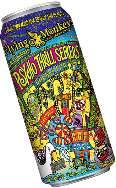 Psycho Thrill Seekers is a pop-your-top, dizzying, hazy Double IPA. Brewed with Cryo Citra hops and Idaho7, the kettle is also dosed with the bright, peppery buzz of Indian coriander seed and the pithy zestiness of fresh lemon peels. Then, the whole experience is flavour-amped by dry-hopping with Citra Cryo, Mosaic Cryo, Simcoe Cryo, Cascade, and Eureka! hops. It’s a good ride, man.
